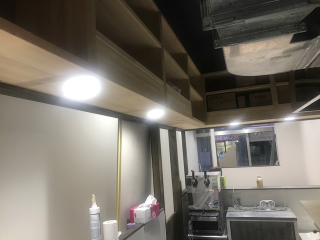 養生から始まり、既存キッチンの解体、お湯・水・排水の切り回し、コンセント移設、ダウンライト取付、お湯・水・排水の結び、可動棚造作は自社施工スタッフが担当し、ガスの切り回しはガス屋さん、キッチンの組立は今回はメーカーさんの施工スタッフにお願いしました。クロスはクロス屋さんに…つまり4社が入って初めてキッチンの工事が納まるわけです。