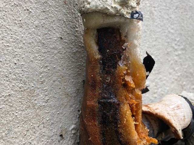 今朝もキッチンの水が凍結して出なかったらしく、給水管の上に巻いてある保温材を破いてみると、保温材自体が凍っている様が写真からも見て取れます。錆もだいぶ侵食しております。