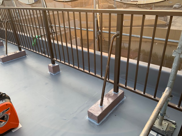 陽射しが強い中、今日もビルの防水工事は粛々とおこなわれております。写真は屋上部のシート防水の様子です。