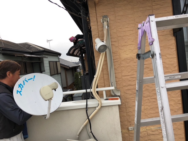 バルコニーに設置してあるエアコン室外機やテレビアンテナなどの移設など前工事を進めていきます。