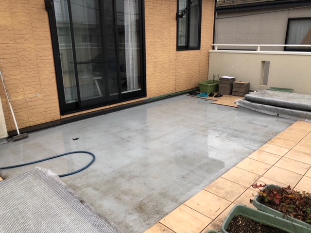 タイルは再利用するので、丁寧に剥がしていきます。そのあと下地の床を水洗いしてキレイに。