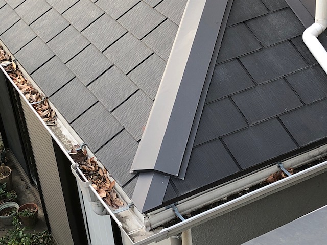 ネットを張り込んでいる最中に、お隣さんの雨樋が見えましたが‥やはり枯葉がギッチリと樋の中を占有しており、おそらくはオーバーフローや詰まりの原因になっているものと思われます。