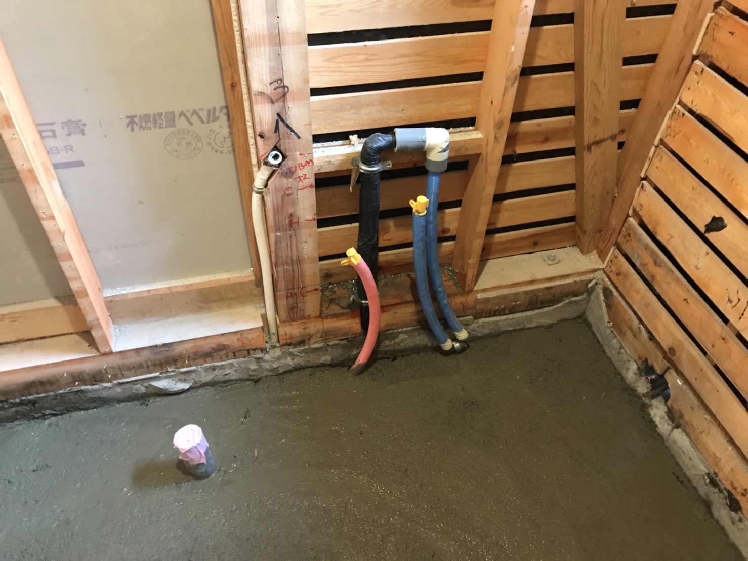 2日目は、換気のダクト工事、給排水・給湯管の切り回し工事、コンクリート打設工事などをおこないました。