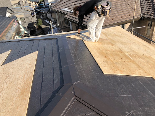合板張り込みが終わったらルーフィングを張り込み、板金の職人さんへバトンタッチとなります。