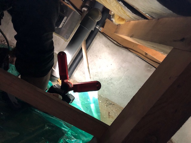 キッチンが変わるので、給水・給湯・排水の位置も変わるのですが、写真のように、床下に入り排水管のやり直し工事なども発生します。結構大変なんです (^^;;