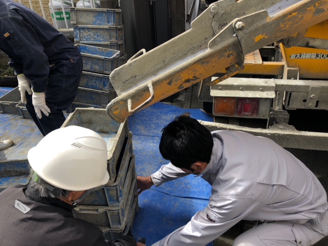 ミキサー車からコンクリを小さなバケツに移して、そこからはバケツリレーで床下まで運んでいきます。
