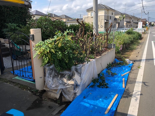 坂戸市 外構工事 木の伐採 コメントを残す トラックが突っ込んで壊れてしまった外構修復工事が着工されました。 花壇に覆い茂っていたアカメの木の伐採から始まりました。 同じように花壇を設けて既存のアカメの木を再度植えて行く場合…また葉が覆い茂るか?どうかは?五分五分との造園屋さんの話から、ブロックプラスフェンスにする運びとなりました。 アカメの木を伐採したことで、道路から玄関側が丸見えになってしまうので、仮の目隠しを作っての工事になります。