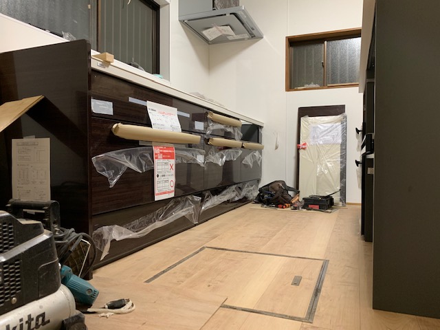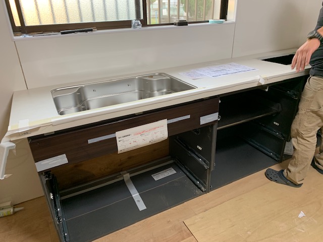 内外装の工事受注を頂き、外装工事を終えて内装工事も大詰めを迎えたお客様宅で、本日はキッチンの組立工事をおこないました。