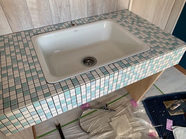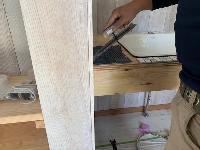 埼玉県川越市のT様邸新築工事で施工した洗面台は、大工さんの造作によるものですが、この上にモザイクタイルを貼っていきます。
