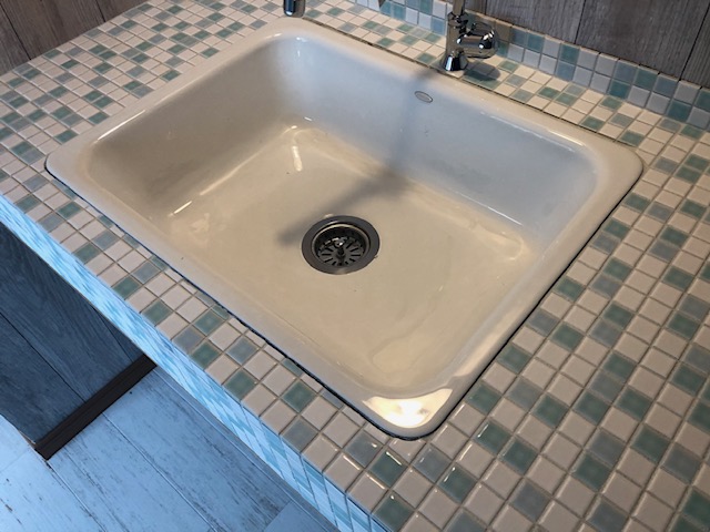 洗面ボールの周りに最後はコーキングしていきますが、なるべく隙間をタイルで埋めておきたいので、タイル1枚を更に半分にカットして貼っていきます。コーナーの丸みを帯びているところも、それなりにタイルをカットしていきます。