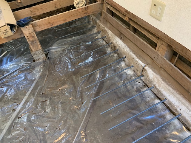 建物の傾きを耐圧盤工法で直すうえで、床下をコンクリートにする工事の2日目です。