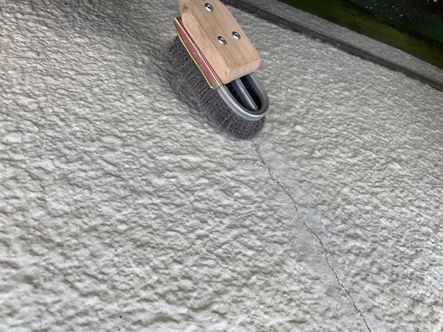 まず、写真ご覧のようなひび割れ箇所を、金ブラシを使って、表面の汚れを落としていきます。