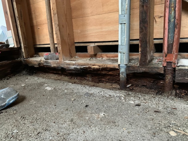 想像以上に土台や間柱は腐っており、四方向のほぼ全てがダメでしたので、解体、配管の切り回し後に補修をおこないます。