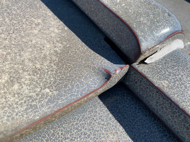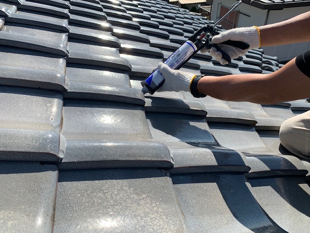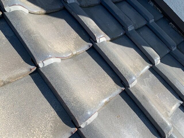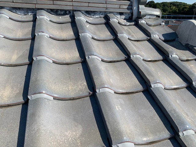 こちらの屋根は、つくば市のお客様宅のものです。瓦の端にグレーのものがみえますが、コレは瓦をシリコンで止めることで、瓦のズレや落下などの防止策として、非常に有効なものになります。 東日本大震災時に、茨城県内で、周りの家屋の殆どの瓦が落ちてしまっているのか、この瓦止めをしていたお宅は、一枚も瓦が落ちなかったという話もあります。