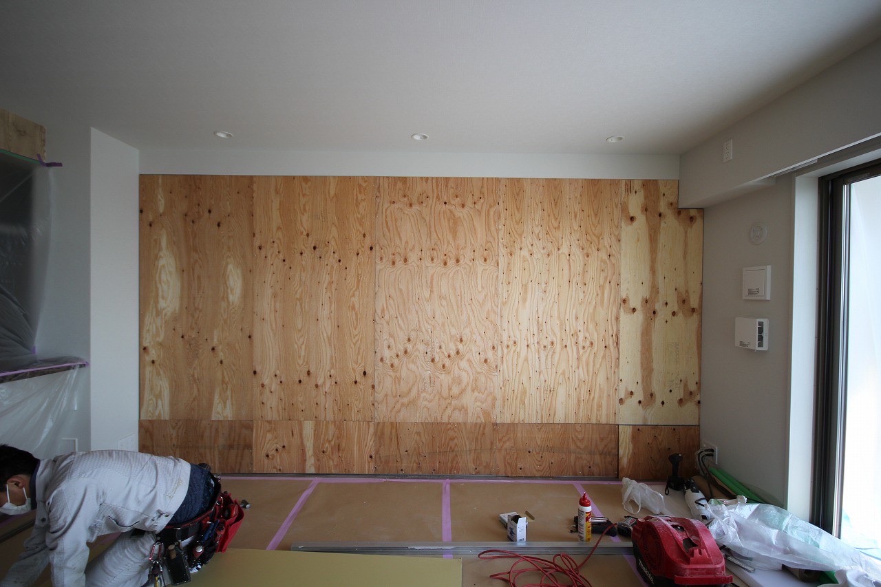 次はベニヤを入れていきます。コレで将来的に 絵やテレビなどを掛けたいと なったときに 何もしなくても 下地が入っているので 直ぐにコレらを掛けることができます。切り物は ベランダを養生して おこないました。
