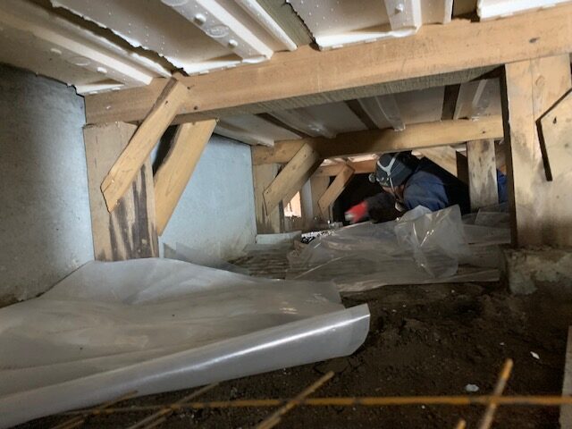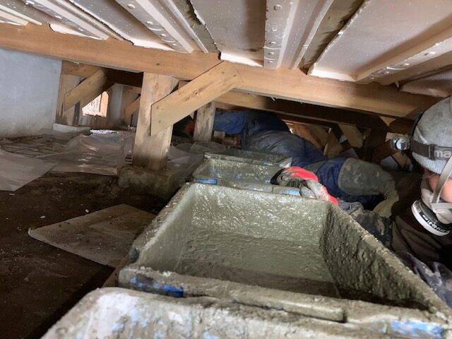 こちらのお宅には 床下に常時3名が潜っており 進入口に1人が地上から箱を受け取り 床下へと引き渡し役をおこないます。