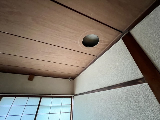 もともとエアコンが一台しか設置できないつくりになっており、玄関にある分電盤から正反対にあるベランダ側のお部屋まで天井裏に、電気の配線を通していきます。