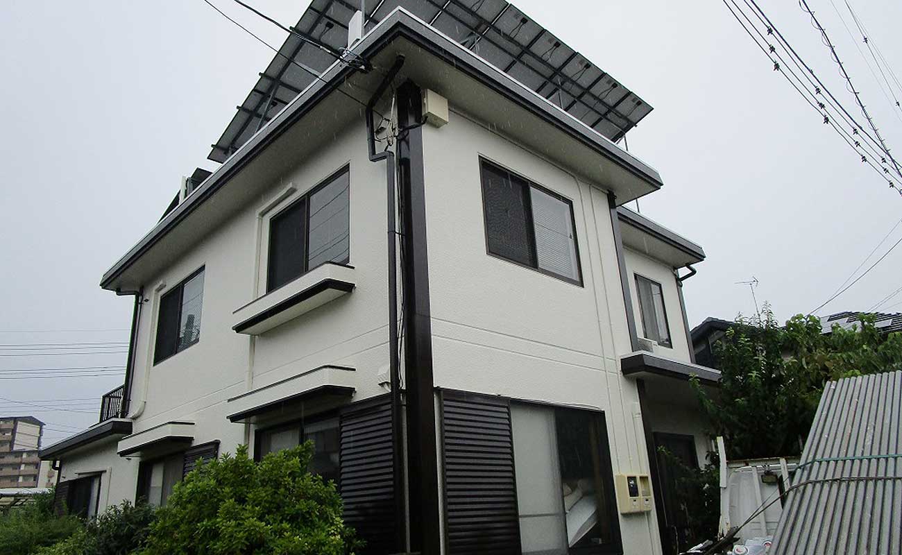 日本ペイントの「パーフェクトトップ」を使用して、下塗り・中塗り・上塗りの3回塗りで塗装しています。同時に破風・雨樋・縦樋・雨戸・戸袋塗装も施工しました。