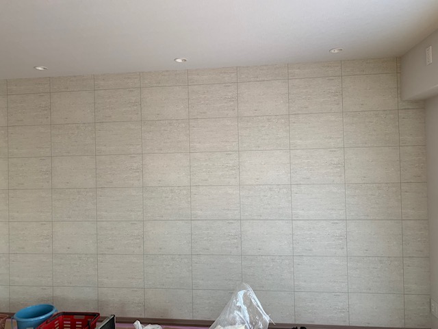 3日間に渡る マンションの内装工事も 本日が最終日です。 リビングのふかし壁部分もクロスが貼り終わり 残すは キッチンにタイルを貼る工事を残すのみとなりました。