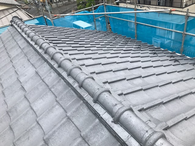 さいたま市の屋根塗装 コメントを残す 前回のブログでは瓦の塗装の必要性などについて書かせて頂きましたが、ご覧のようにシッカリた防水塗装された瓦は、銀黒に輝いております。 「うちは瓦だから塗らなくて大丈夫」…ということではありません。 さぁ、あとは霧よけ屋根の塗装をして完成です。