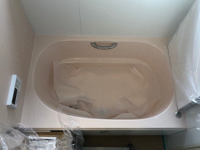 既存のタイル風呂を解体して、コンクリート土間打ち、給排水切り回し、換気ダクト工事を経て、ユニットバスの組立工事になります。