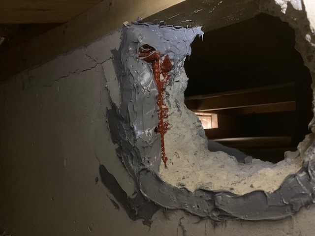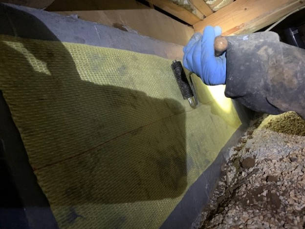 配管が入り組んでいるところは、アラミド繊維を切り分けて、貼っていきます。仕上げに、補強剤を上塗りしていきます。露出している鉄筋は、念の為に、錆止めを塗布。