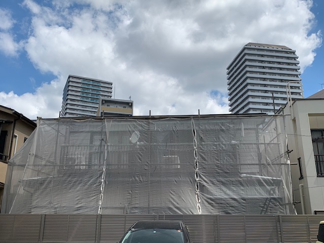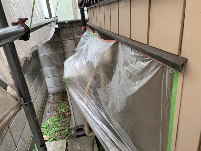 足場を組立て、まどまわりにも養生をしていきます。