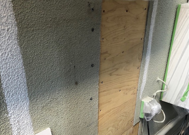 シートを貼って、合板を貼り、その上からケイカル板を貼り、塗装で仕上げました。