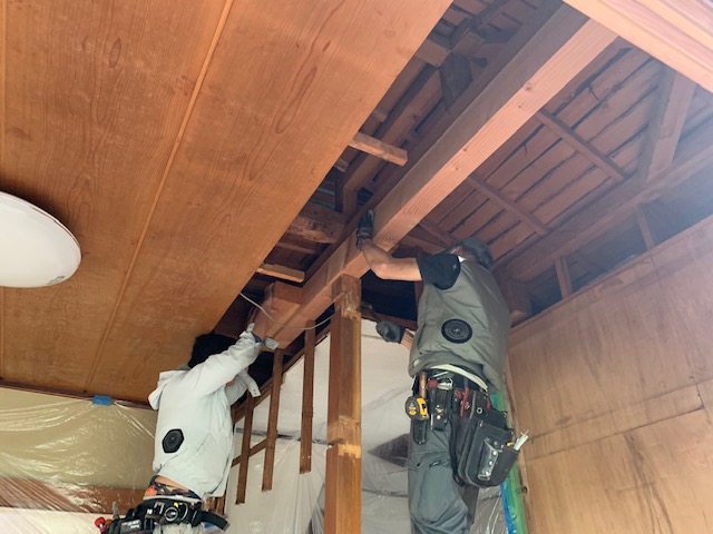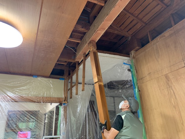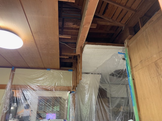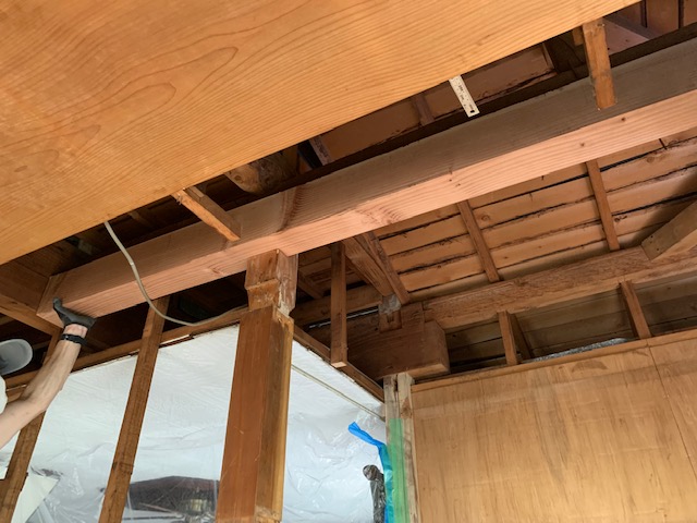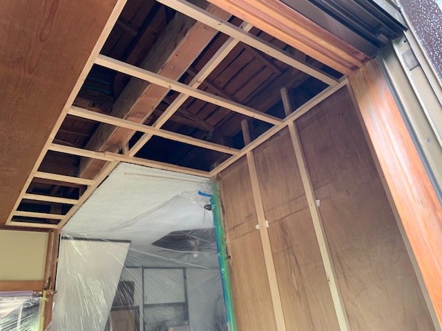 さて、塗装、屋根工事などの外工事を終えて、工事はいよいよ内装工事に移っていきます。 畳からフローリングに変更して、押し入れなどを壊して空間を広げていきたいというのが、施主様のご要望です。