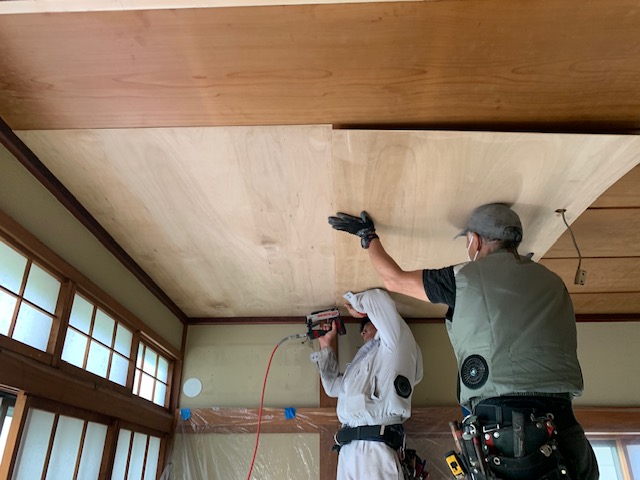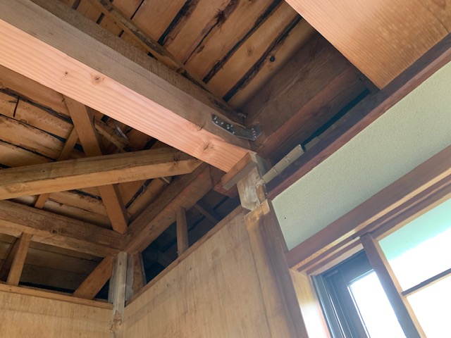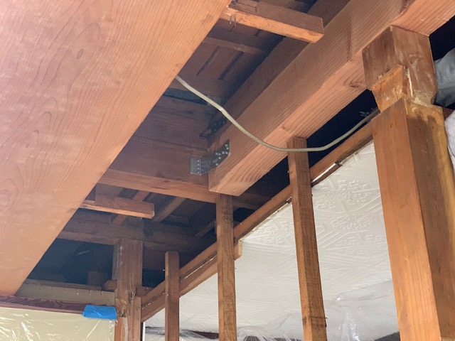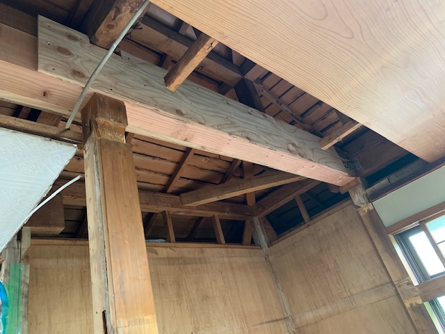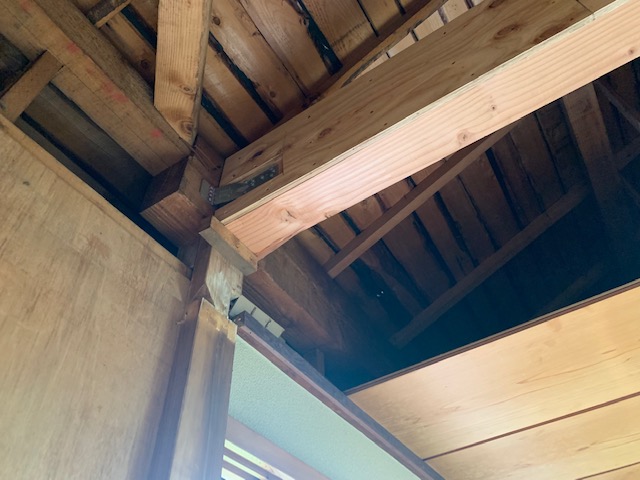 元々の桁と新しく架けた梁を合板で一体化させていきます。 こうすることで、強度が生まれます。