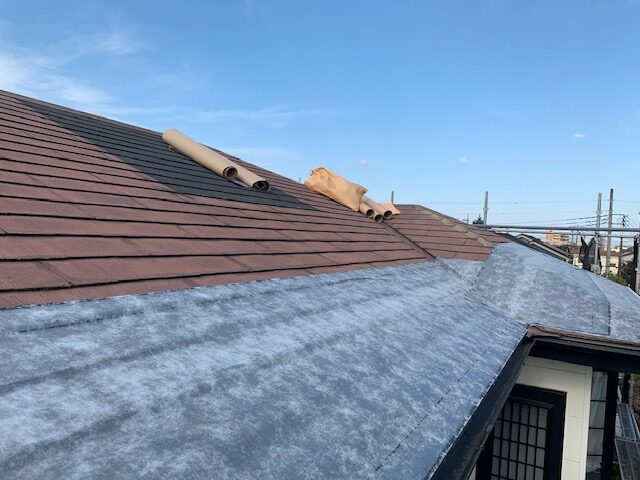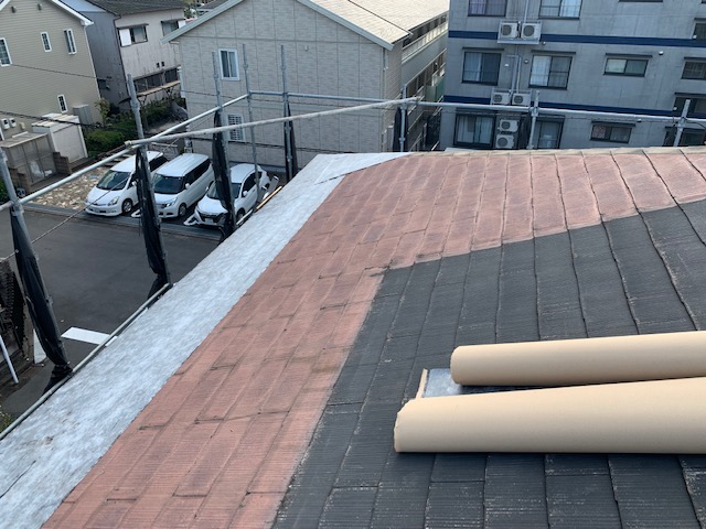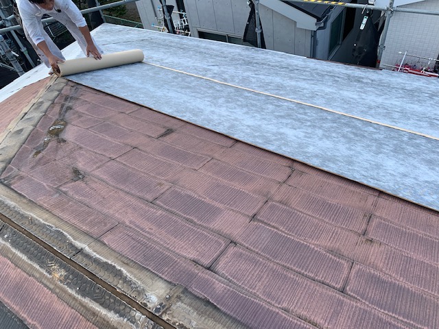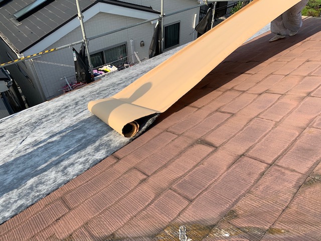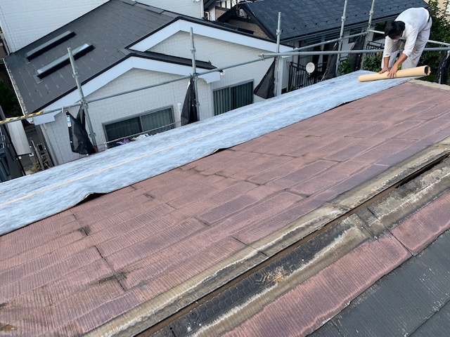 この度、ご縁があって、屋根のカバー工法工事のご依頼を頂きました。 工事の初日の本日は、ルーフィングを敷設していきます。