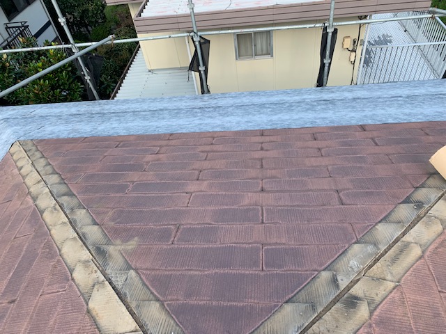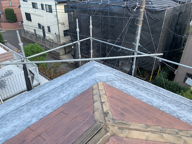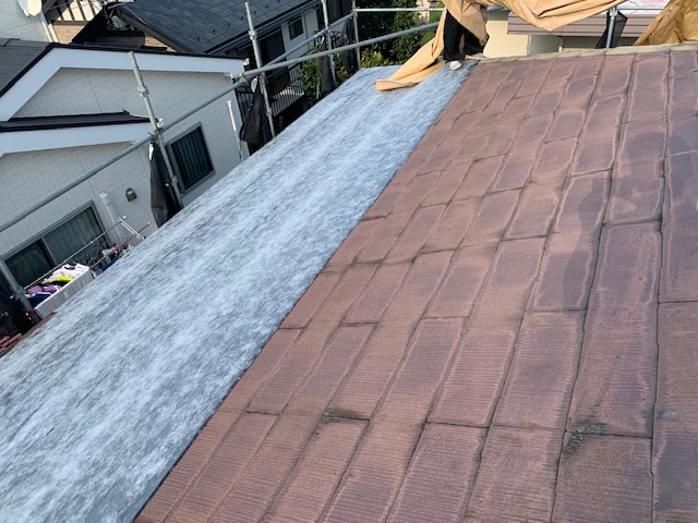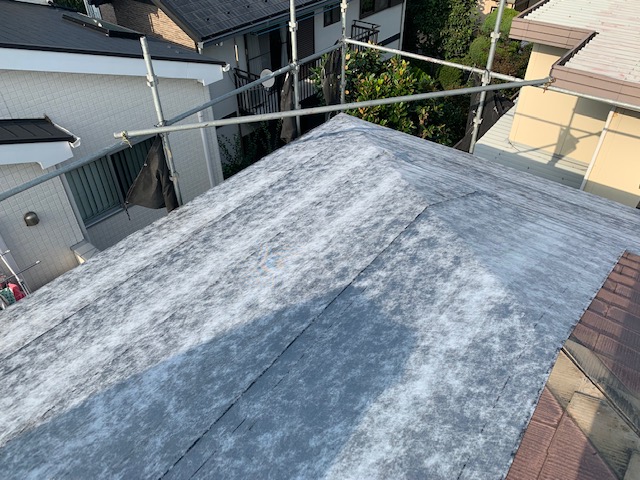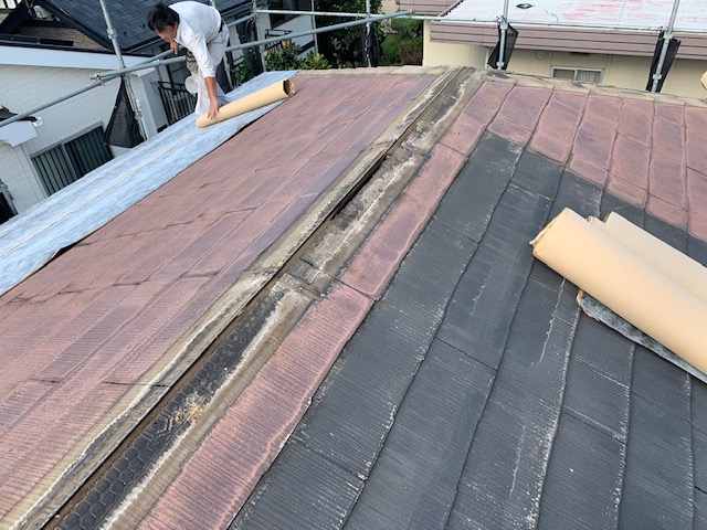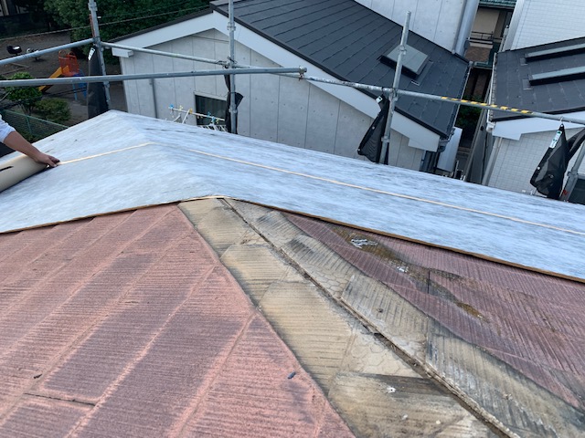 棟の板金を解体し、ご覧のような状態です。 その後、軒先から棟部分にかけて、ルーフィングを敷設していきます。今回の工事は、既存のスレート屋根の上に屋根を重ねて貼っていくカバー工法なので、粘着層ルーフィングを使用していきます。