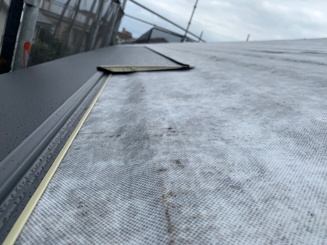 ガルバニウムカバー工法の工事現場に、顔を出しました。 ルーフィングの敷設を終えて、軒先にスターターを取り付けていきます。 スターターとは?