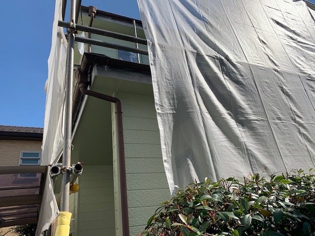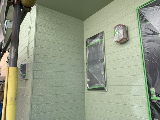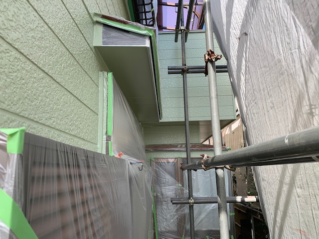 ご希望は、外壁、軒天まで、淡いグリーンで塗装し、破風と雨樋は、濃いグリーンで塗装して欲しいとのことでした。