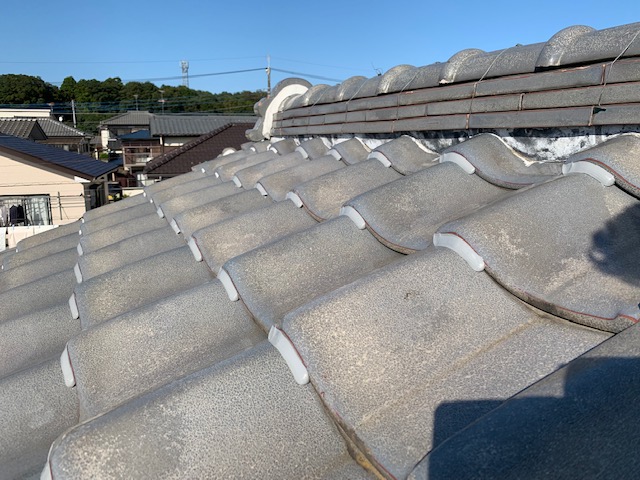 こちらの屋根は、つくば市のお客様宅のものです。瓦の端にグレーのものがみえますが、コレは瓦をシリコンで止めることで、瓦のズレや落下などの防止策として、非常に有効なものになります。 東日本大震災時に、茨城県内で、周りの家屋の殆どの瓦が落ちてしまっているのか、この瓦止めをしていたお宅は、一枚も瓦が落ちなかったという話もあります。