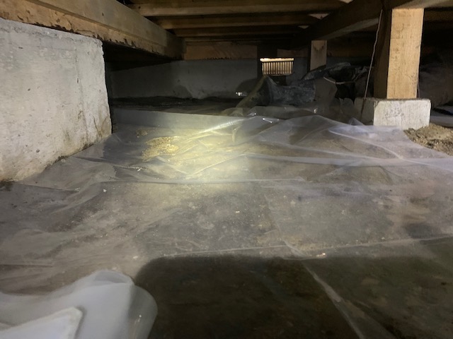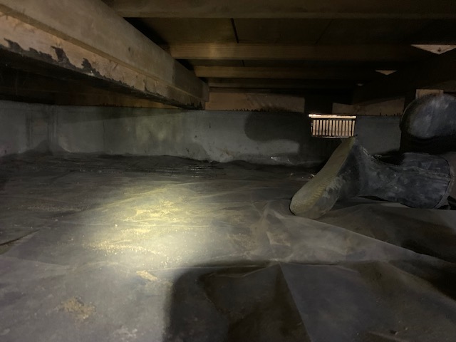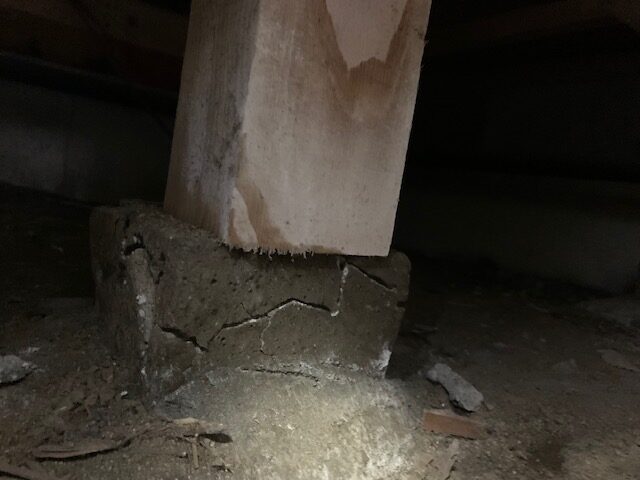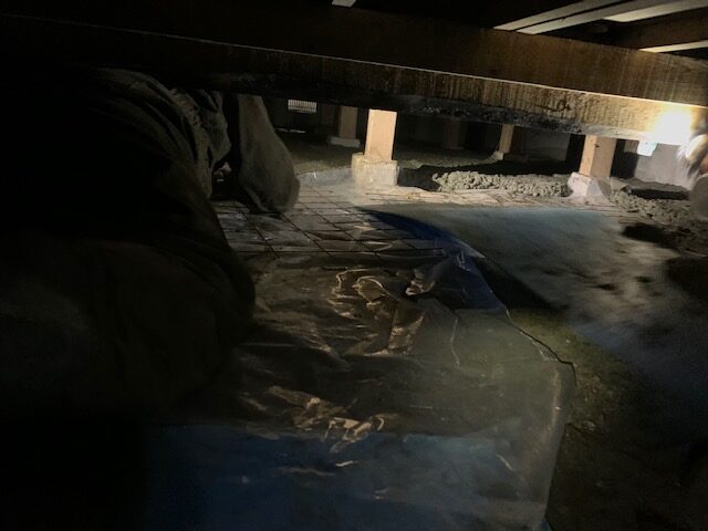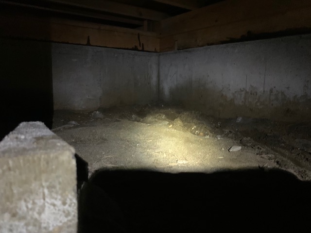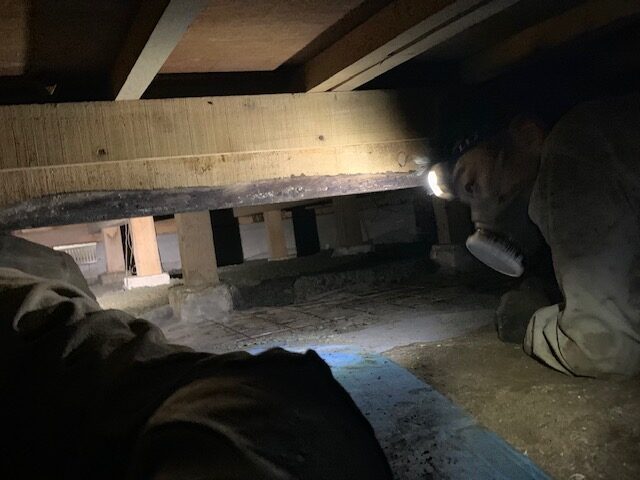 点検口を開けると、確かにカビっぽい臭いがあがってきます。 実際に、床下に潜る時白カビが目立ちます。 束石も白くなっております。