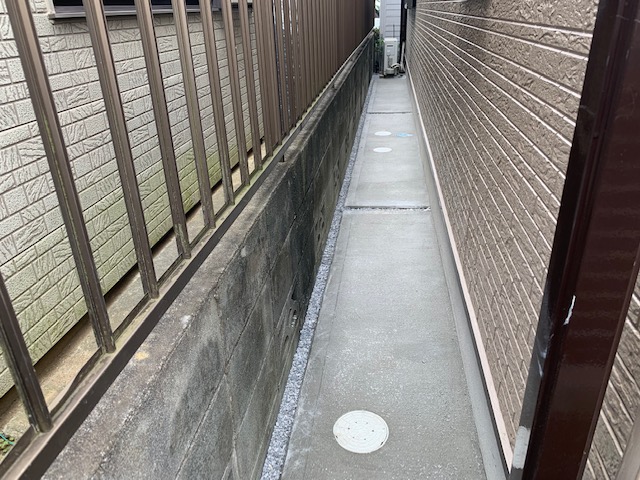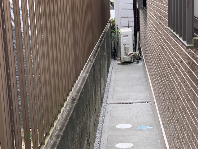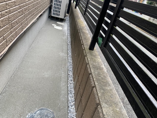ブロック塀沿いやエアコンの室外機下をコンクリートにしないのは、水が溜まりやすくしないためです。 砂利のところに、水が流れていき、浸透させてくれるために、全部にコンクリートを打たないようにしております。