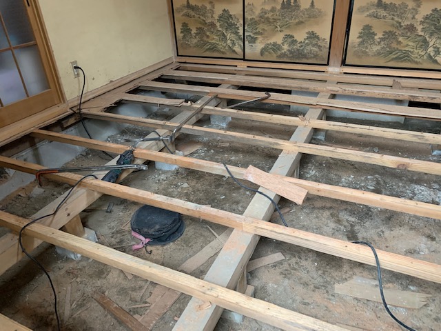 和室のほうは、散布完了です。 あとは、フローリングにするにあたって、根太を配って高さを調整し、合板を敷いていきます。