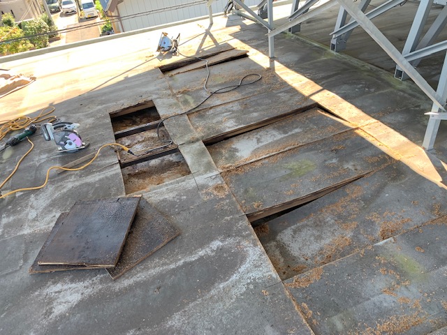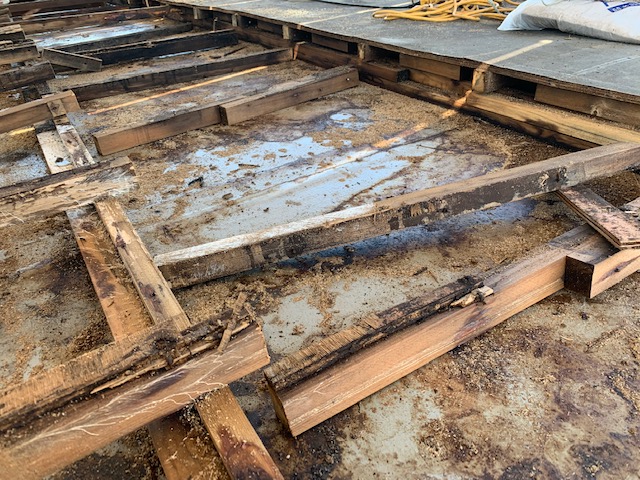 本日、既存の床を解体する為に、伺いました。 どうやら、垂木、根太、ベニヤと木を使い、床の下地を作ったようです。 だいぶ、木が傷んでおり、その為に、床がべこべこになってしまったようです。