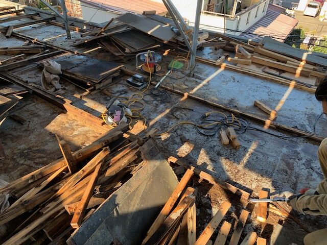 元々の床が出てまいりました。 解体が終わったら、この上に、左官工事を入れて、勾配をとり下地を作っていきます。 その上に、ウレタンで防水処理をしていく予定です。