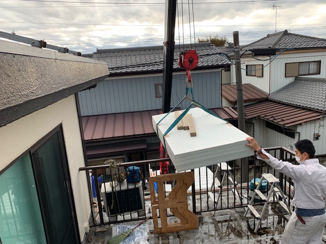 ユニックで、ケイカル板を上げていきます。