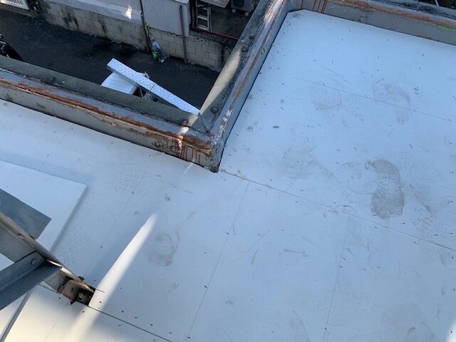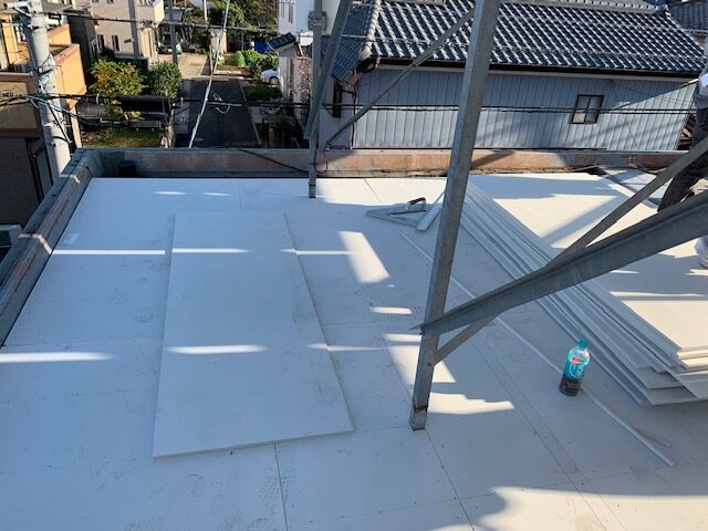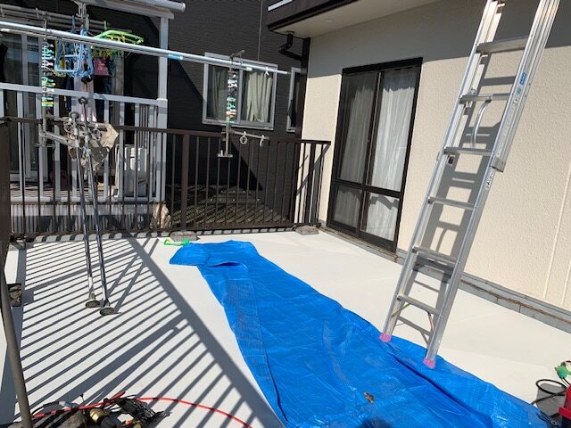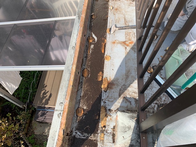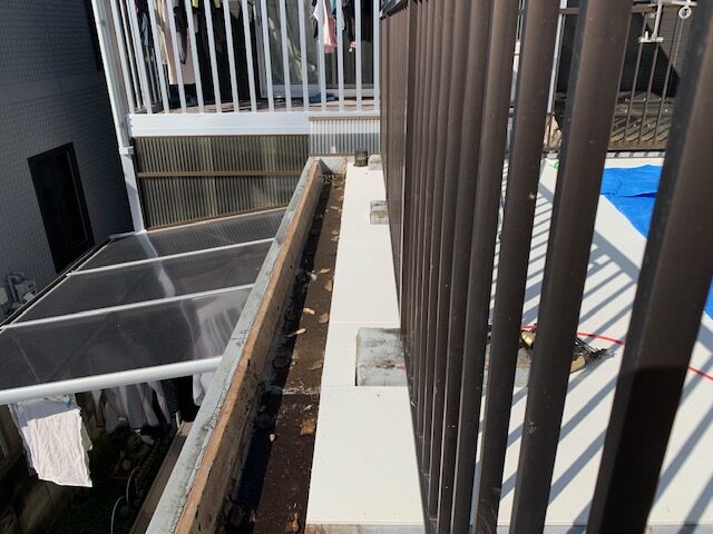 どんよりとした曇り空のなか、ベランダと屋上の防水工事の床下地作りの工程になります。