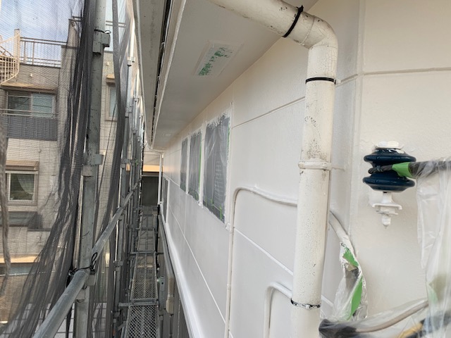 志木市の屋根・外壁塗装のおたくに伺いました。 鉄部の塗装、ベランダの天窓周りの防水処理を終えて、いよいよ建物本体の塗りに入りました。