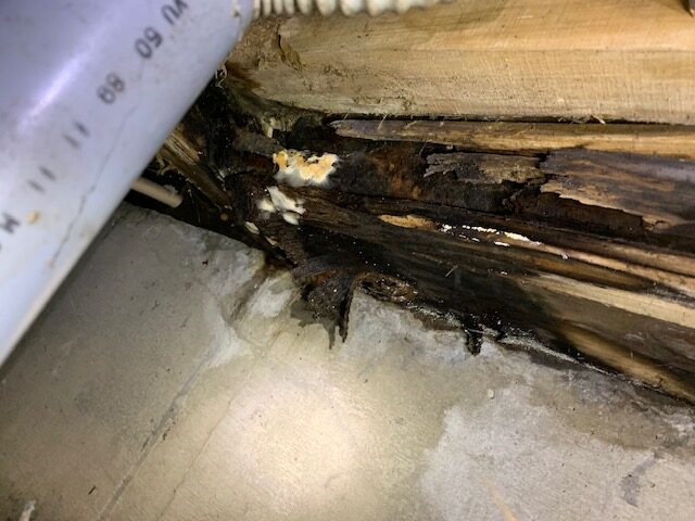 床下からみると、明らかに浴室が水漏れをおこしていることがわかります。 土台が水に濡れて、グズグズになってしまってます。 このまま、放っておき、更に木を水に晒していくと、土台が弱くなり下に落ちていくわけですからよくありません。