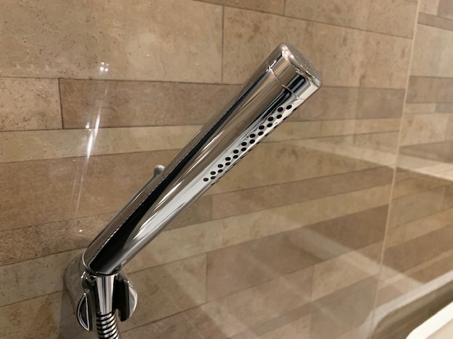 オーバーヘッドシャワーです。 天井からシャワーが降ってきます。 私も、外国の映画などで、天井からシャワーが降ってくるシーンを観て、憧れたものです。 手前の丸い物体は、打たせ湯です。 肩こりなどがひどい時に、良さそうです。