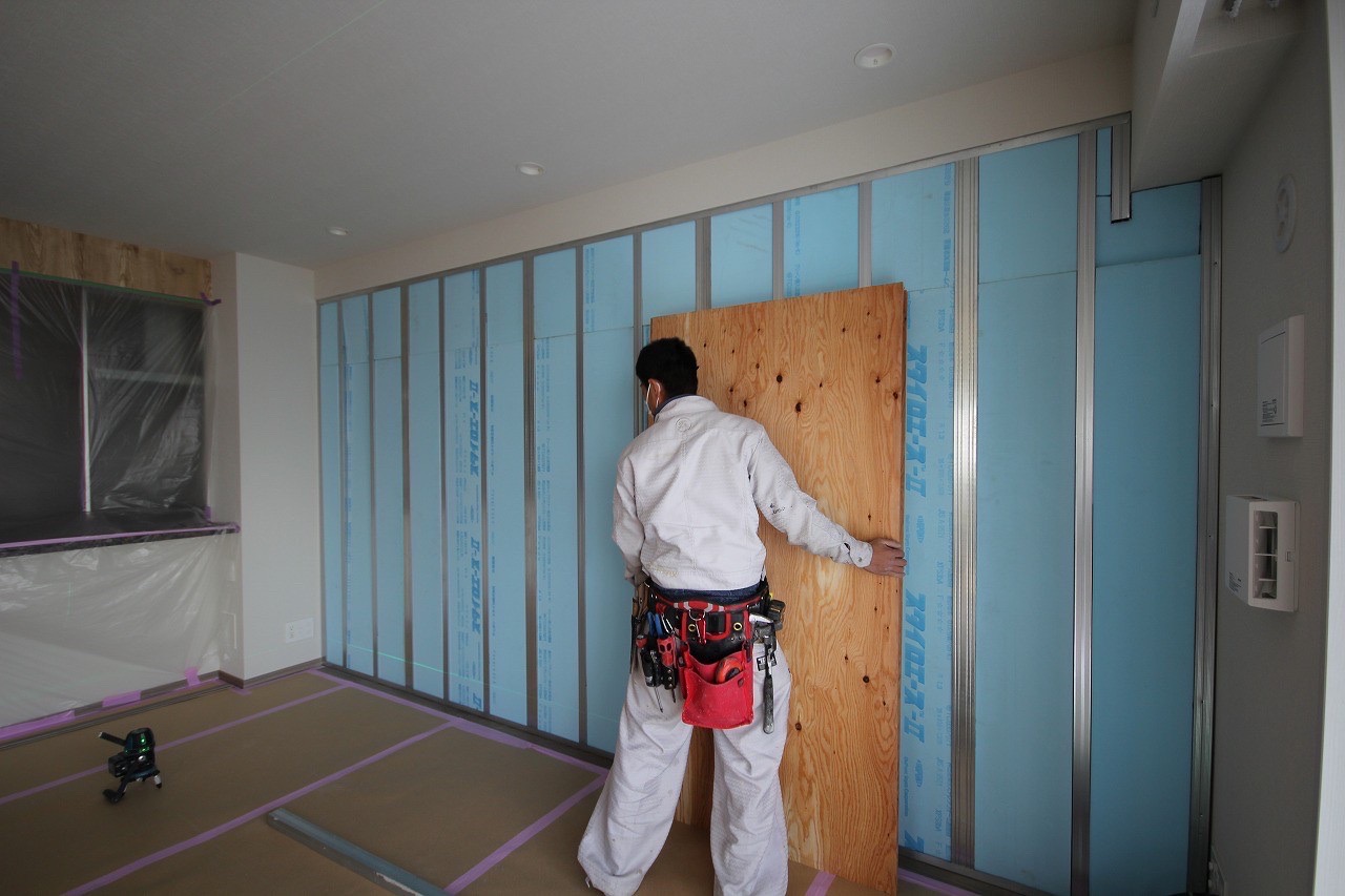 梁の面に合わせて壁の下地を作っていきます。 軽鉄材を使用して 間柱を組み上げます。 青い材料はスタイロホームです。 マンションのふかし壁工事などをすると 太鼓現象というものが起きやすいと言われております。