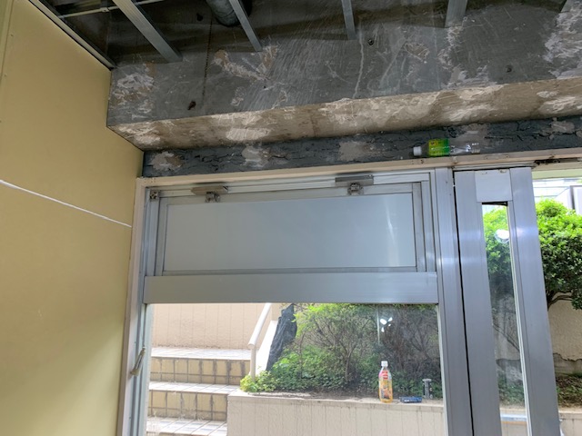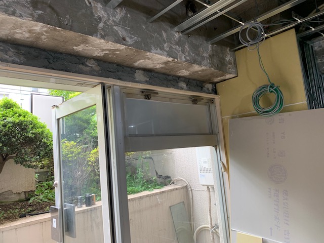 明日から空調工事に入るので サッシ屋さんに既存の排煙窓を外してもらいアルミのパネルをはめてもらいます。 ここから厨房のダクトが外に逃げていくんですね。