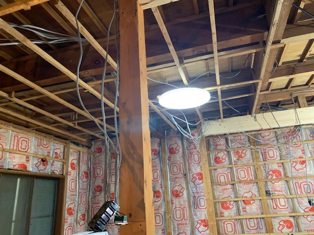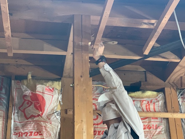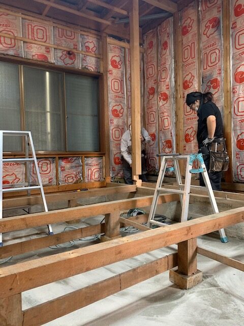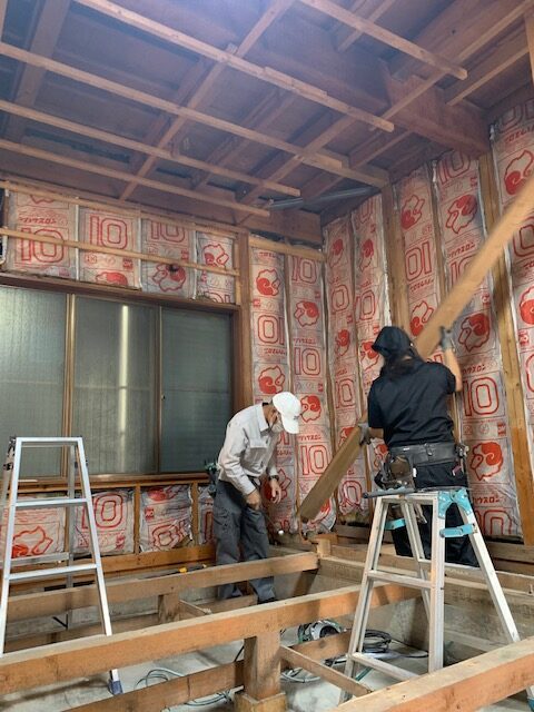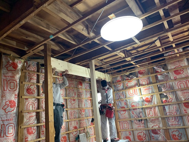 手前に見える白木の柱は 仮で建てております。新たに梁を入れるまで応急的なものです。