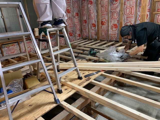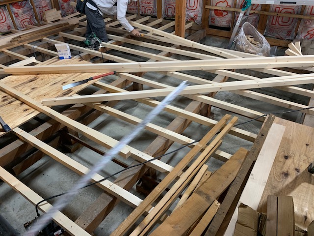 床に新たな根太を配りました。 下もコンクリートにはり 木部が傷むことは今後そうそうありません。