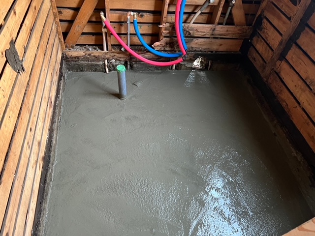 2日目は脱衣場の床レベルとユニットの床レベルを合わせる為に、コンクリートを打っていきます。